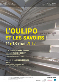 L’Oulipo et les Savoirs Du 11 au 13 mai 2017 11 et 12 mai 2017 : Université Paris Diderot, bâtiment Sophie Germain, amphi TuringSamedi 13 mai 2017 : INHA, auditorium, 2 rue Vivienne, 75002 Paris /B_mots>