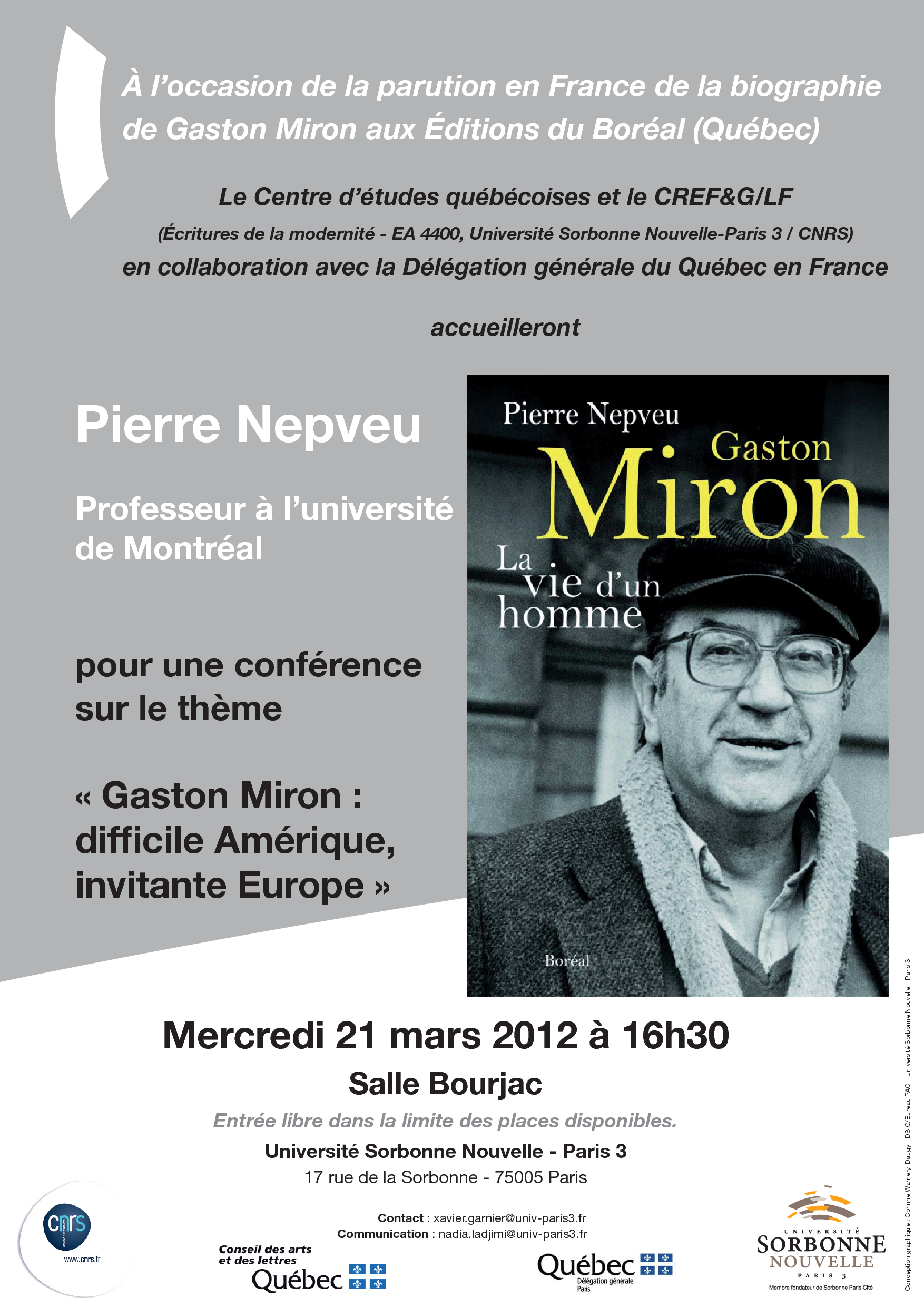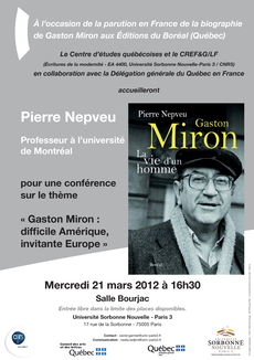 A l’occasion de la parution en France de la biographie de Gaston Miron aux Éditions du Boréal (Québec), le Centre d’études québécoises et le CREF&G/LF (EAC4400 Paris 3 / CNRS), en collaboration avec la Délégation générale du Québec en France, accueilleront Pierre Nepveu, professeur à l’université de Montréal, pour une conférence sur le thème "Gaston Miron : difficile Amérique, invitante Europe".