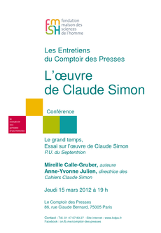 "L’œuvre de Claude Simon" avec Mireille Calle-Gruber (CREF&G/LF), auteure, entre autres, de Le Grand Temps, Essai sur l’œuvre de Claude Simon (P. U. du Septentrion) et Anne-Yvonne Julien, directrice des Cahiers Claude Simon (P. U. de Perpignan).