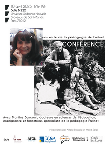 La conférence "Découvrir la pédagogie Freinet" a lieu dans le cadre d’un projet de recherche accompagné par la Cité des Ecritures (Catherine Dasté un chemin de théâtre/le matrimoine au théâtre). L’équipe porteuse du projet (Céline Hersant, Sara Bompani, Marco Consolini, Armelle Bossière, Marie Sorel) accueillera Martine Boncourt, docteure en sciences de l’éducation, membre de l’ICEM-Freinet, enseignante et formatrice, autrice et co-autrice de nombreux ouvrages sur Freinet(Dictionnaire de la pédagogie Freinet ; La Pédagogie Freinet en maternelle ; Apprendre le français à l’âge adulte : avec la Méthode Naturelle). Cette conférence présentera les principes, pratiques et évolutions de la pédagogie Freinet. Cette rencontre, modérée par Armelle Bossière (SN, IET, IRET) et Marie Sorel (SN,LLFL, THALIM), se fait en collaboration avec la Cité des Ecritures, le RITE (Réseau Intervenants Théâtre Education), le programme EnJe (Enfance Jeunesse), ICEM Freinet et la Théâtrothèque Gaston Baty.