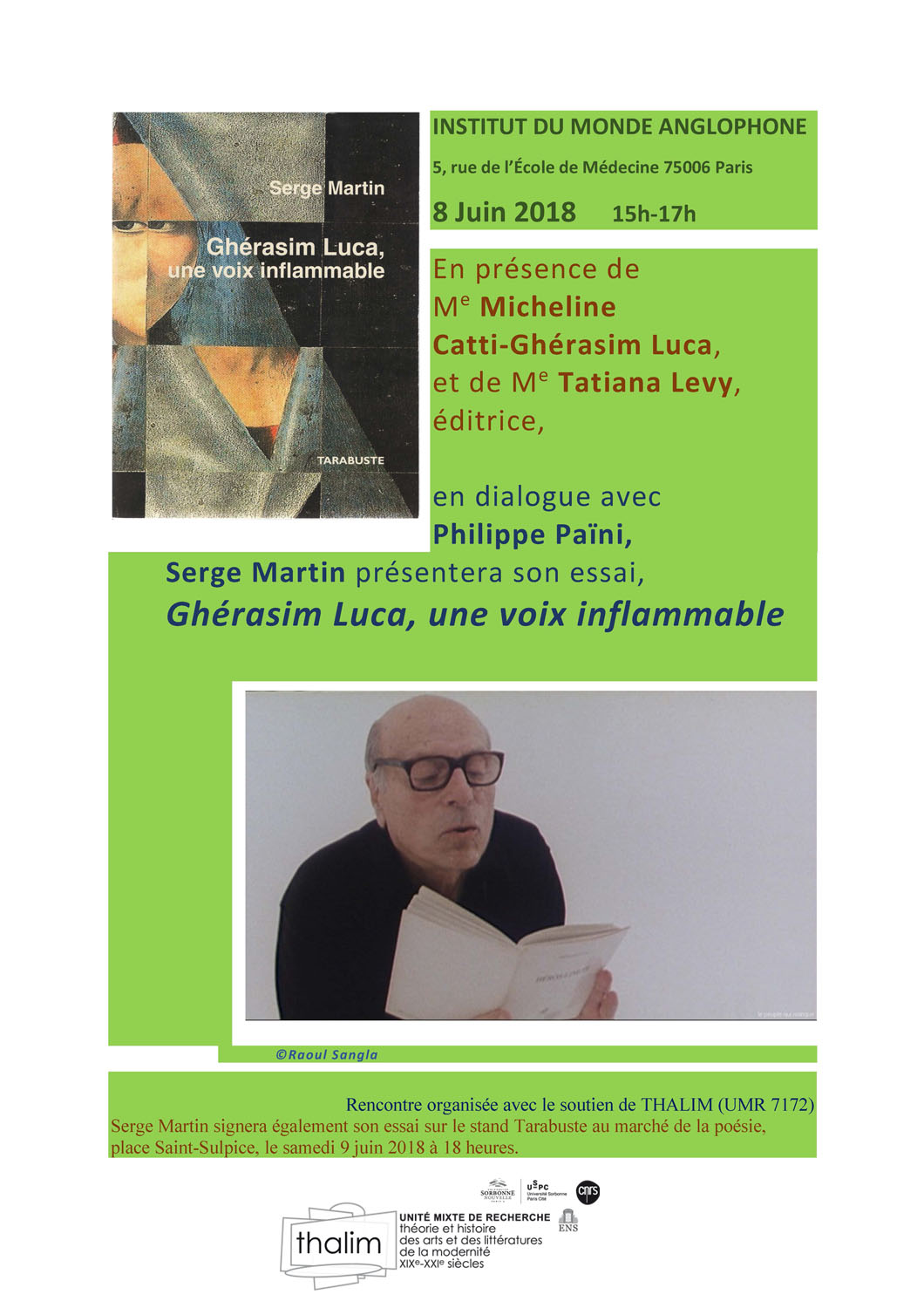 En présence de Mme Micheline Catti-Ghérasim Luca et de Mme Tatiana Levy, éditrice, en dialogue avec Philippe Païni, Serge Martin présentera son essai Ghérasim Luca, une voix inflammable