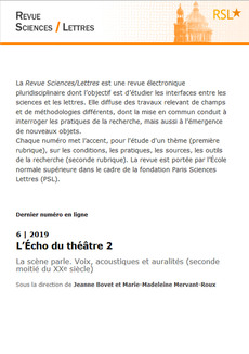 , Jeanne Bovet (dir.), L’Écho du théâtre 2 La scène parle. Voix, acoustiques et auralités (seconde moitié du XXe siècle), Revue sciences/Lettres, n° 6, éditions rue d’Ulm http://www.presses.ens.fr/, Mai 2019