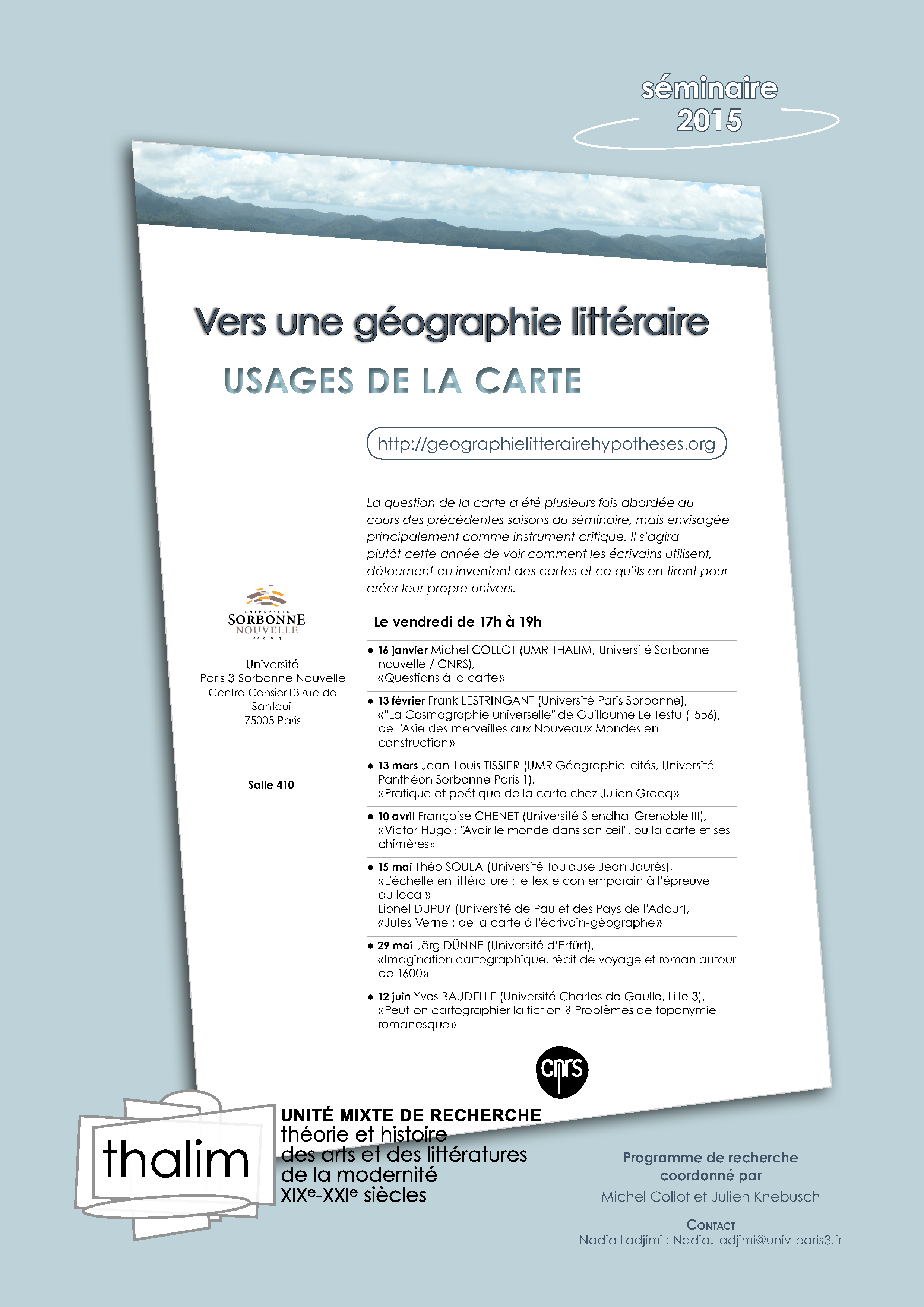 La question de la carte a été plusieurs fois abordée au cours des précédentes saisons du séminaire, mais envisagée principalement comme instrument critique. Il s’agira plutôt cette année de voir comment les écrivains utilisent, détournent ou inventent des cartes et ce qu’ils en tirent pour créer leur propre univers.