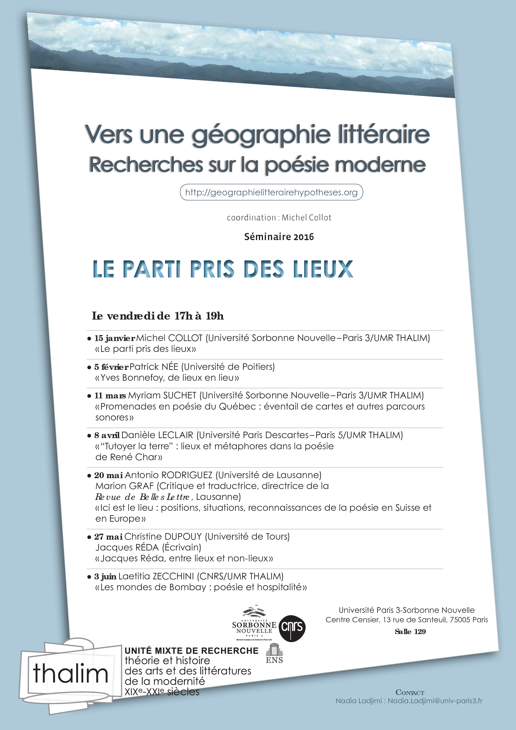 Ce séminaire 2016 croisera les recherches sur la géographie littéraire et sur la poésie moderne menées ces dernières années à Paris 3, dans une perspective comparatiste et pluridisciplinaire. Il s’agira d’étudier la représentation des lieux dans la poésie moderne, en s’interrogeant sur ce qui la distingue d’autres formes d’expression, étudiées antérieurement (roman, nouvelle, essai, théâtre), ou d’autres périodes littéraires, et de confronter les enjeux divers qu’elle peut revêtir dans différentes aires géographiques, linguistiques et culturelles, en fonction de choix esthétiques et contextes politiques et historiques particuliers.